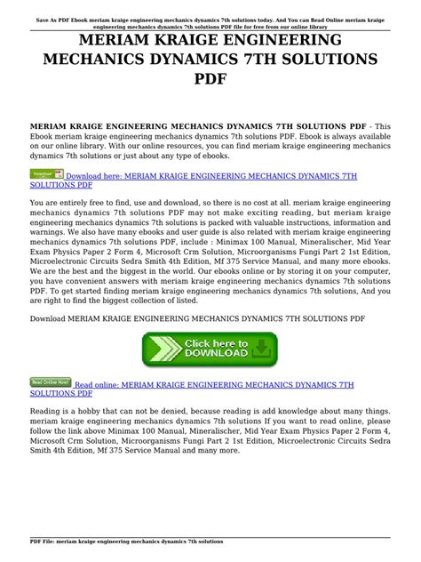 Read Meriam Kraige Engineering Mechanics Dynamics 7th Solutions Doc